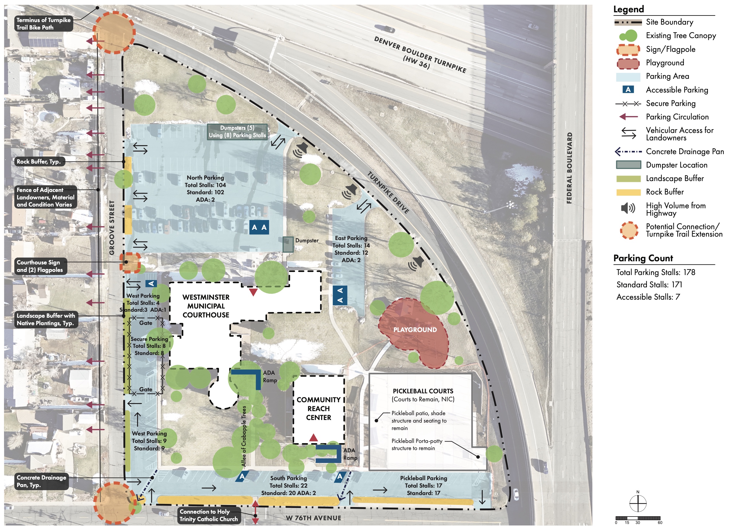 The existing site map shows opportunities and constraints on the Municipal Courthouse site.